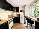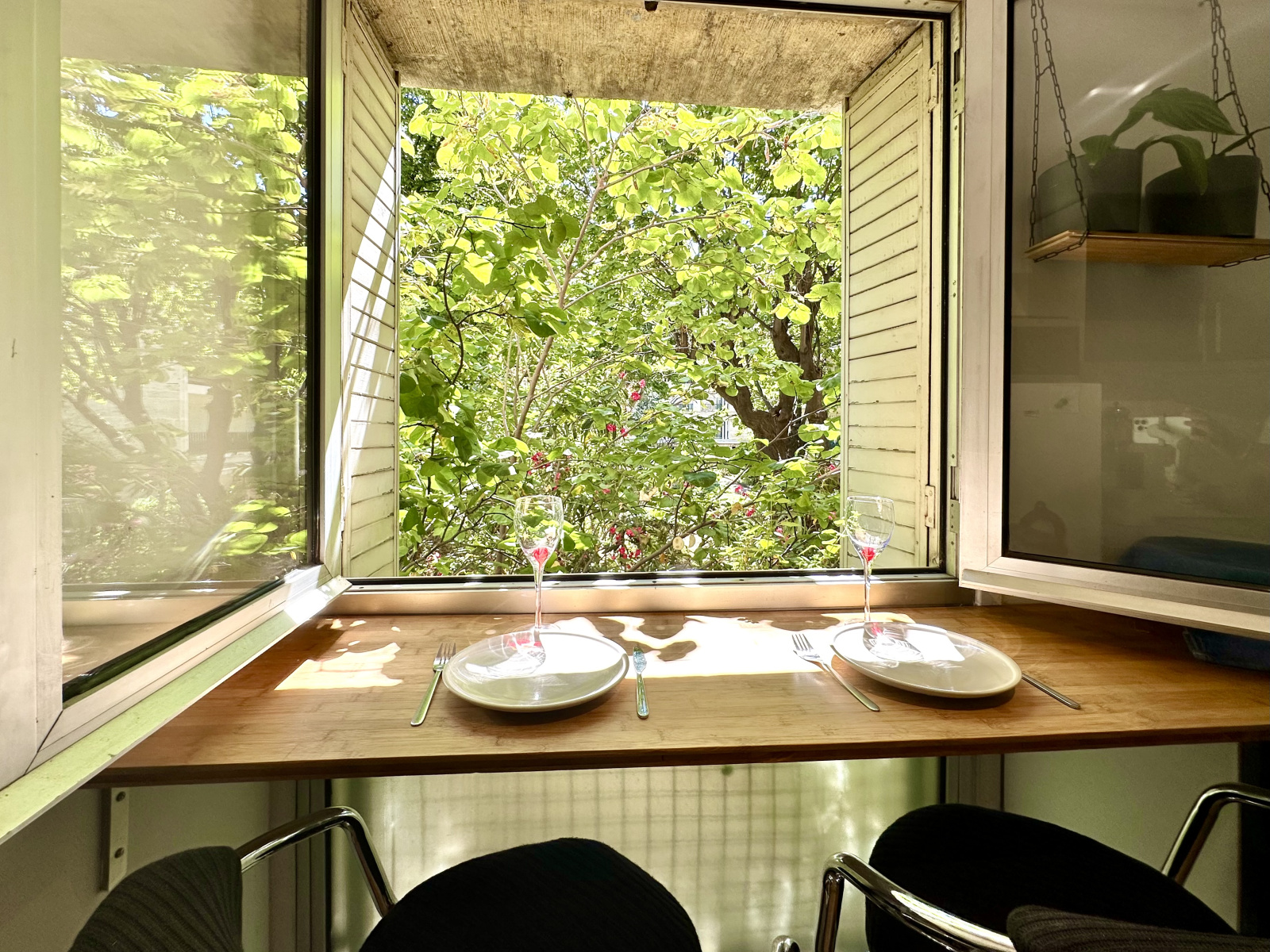 La cuisine indépendante s’ouvre sur un écrin de verdure, propice aux repas en toute tranquillité.